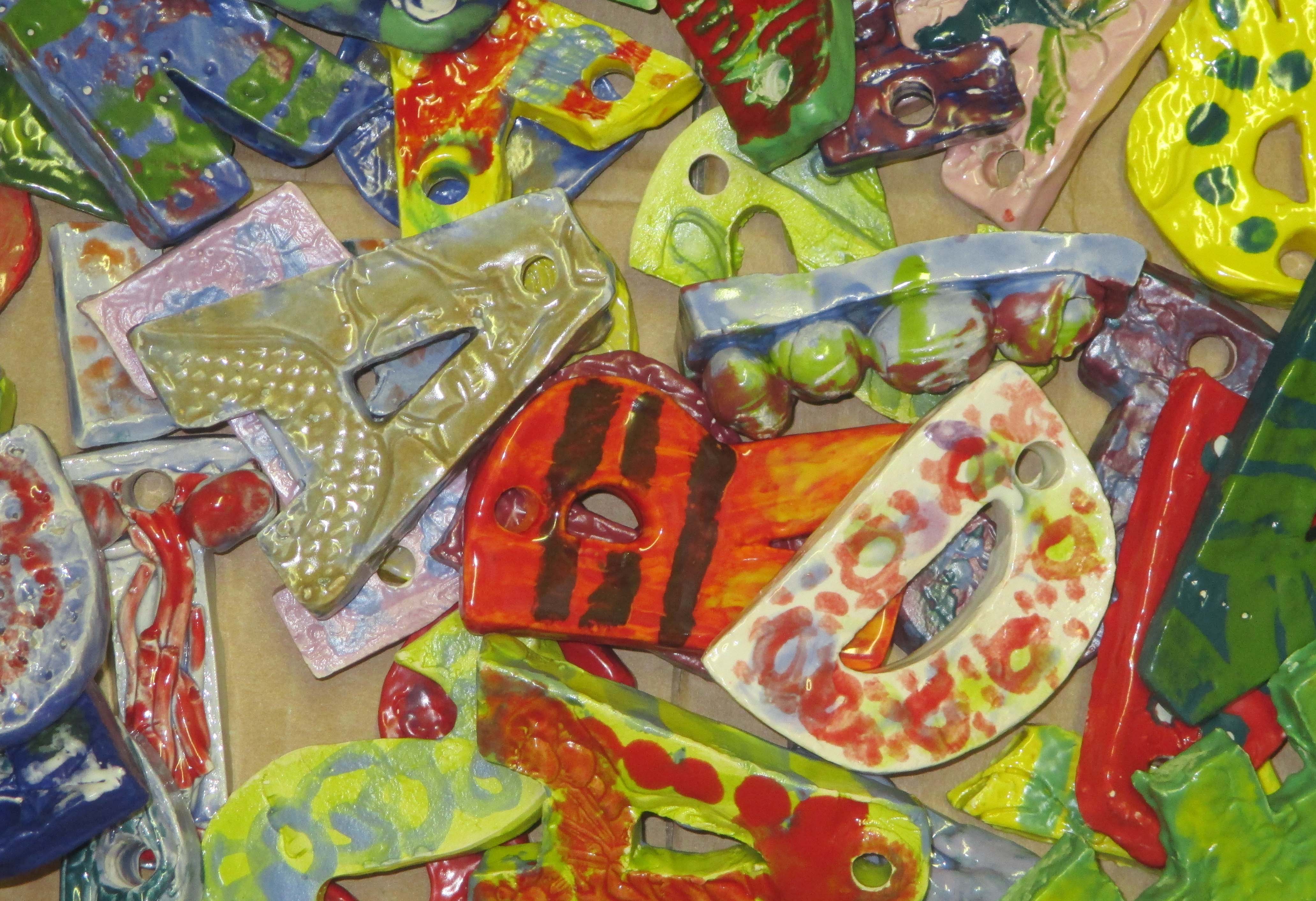 The letters have been cut from slabs of firing clay and decorated by the artists of the Enrichment Center, with imprints and relief. They (the letters, not the artists!) were then fired to bisque in our kiln. The artists then spent two weeks painting the letters with glaze, before firing up the kiln again during the week of Thanksgiving.