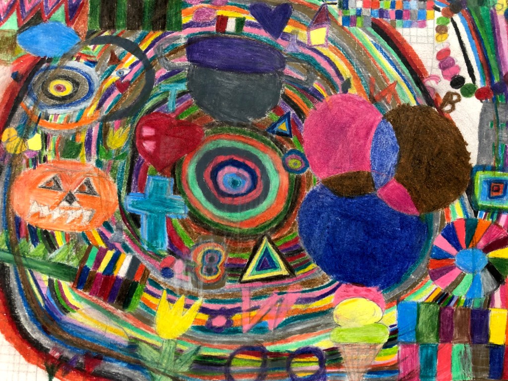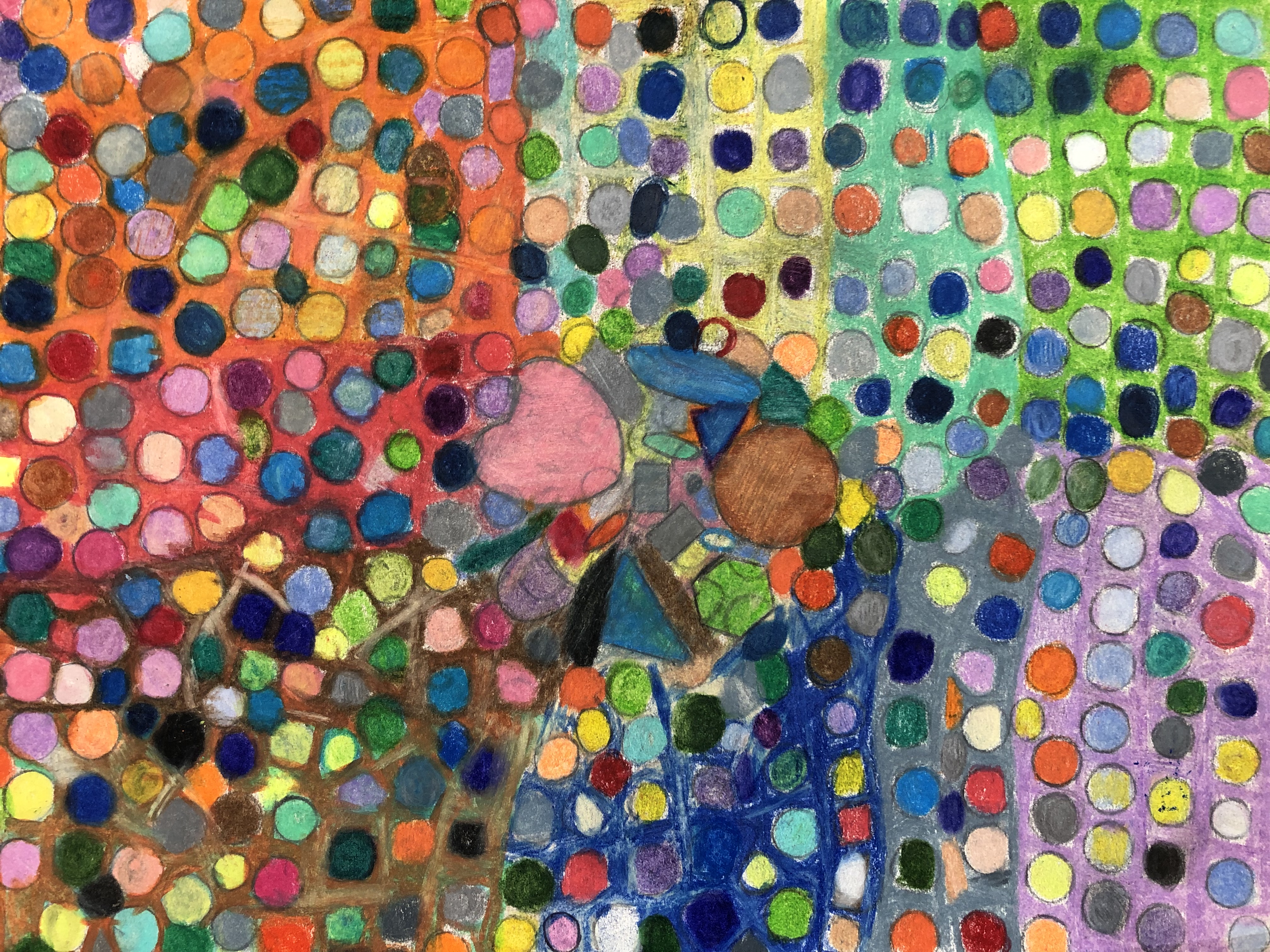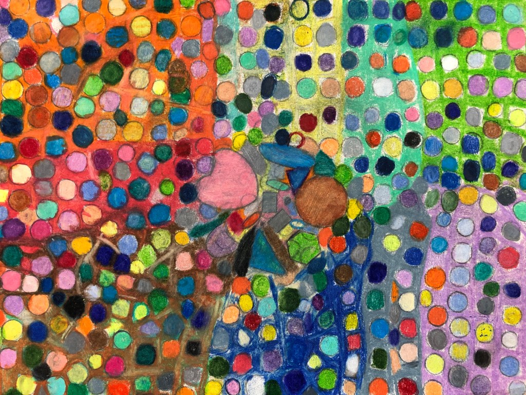 I attempt to use every color available, for example if I am using a set of 72 count colored pencils I am going to use all 72 colors in my piece. In my paintings I prefer to work in small brushes, starting and ending my focus in detail. I carry the use of maximum color in all my work.