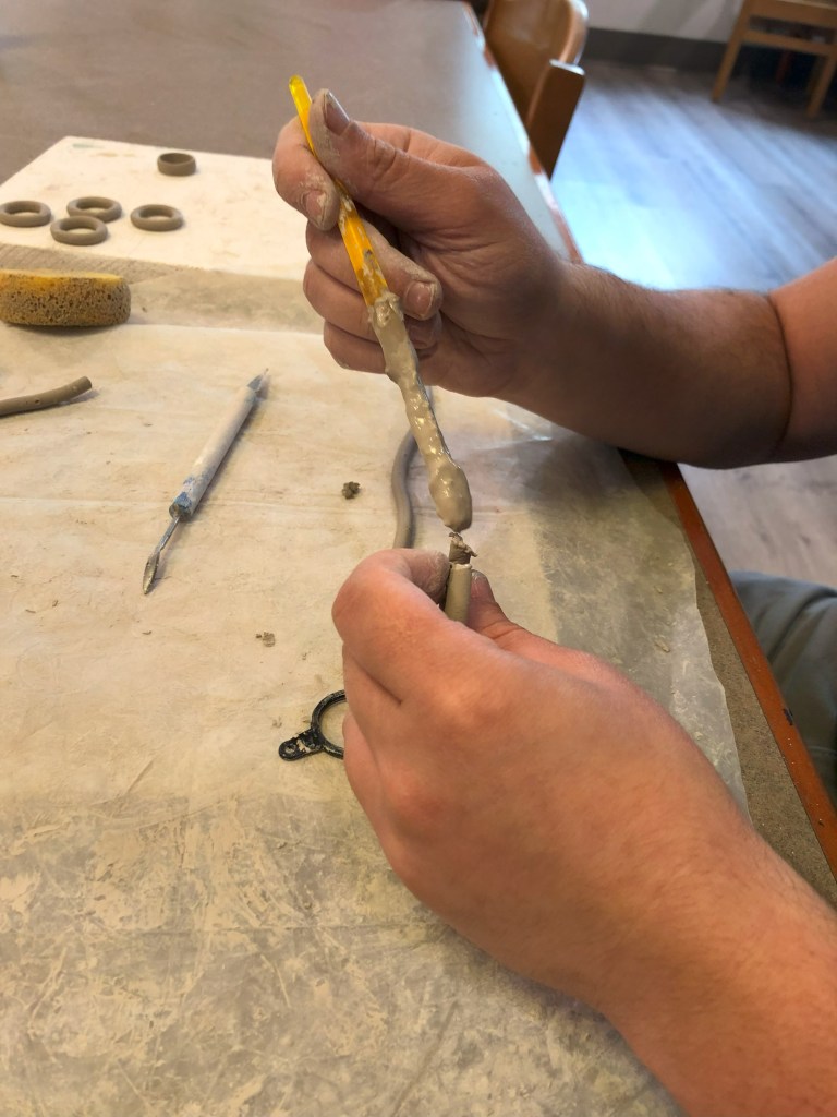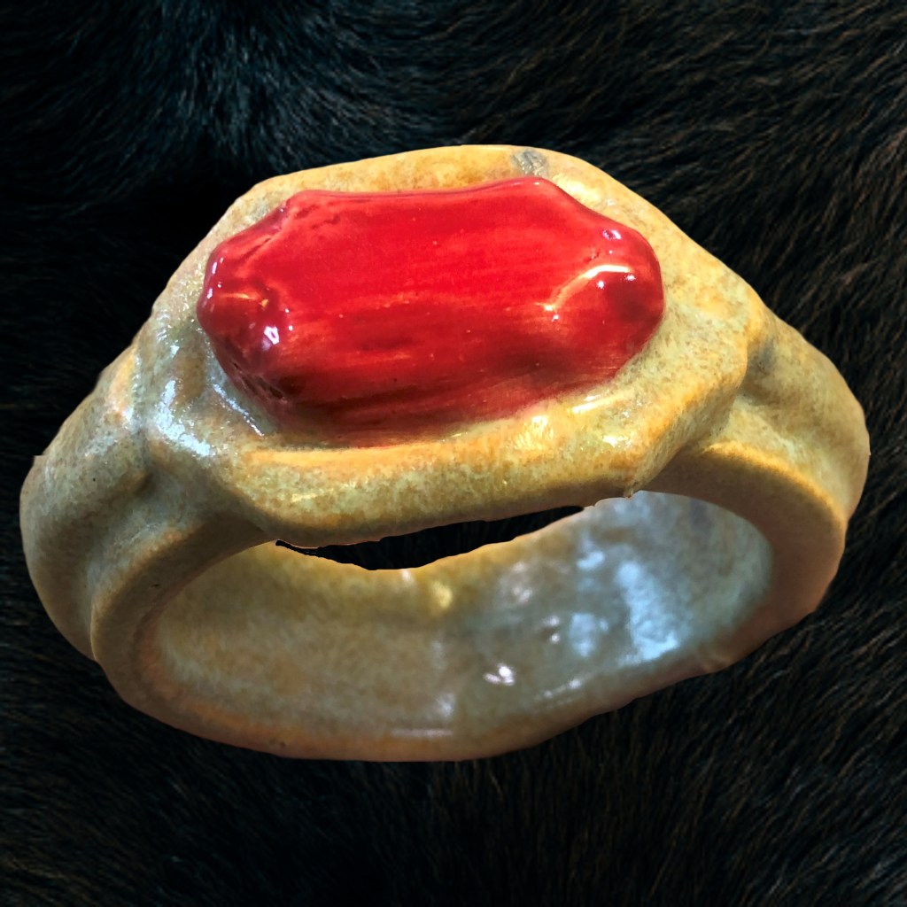 I work in ceramics, right now I just finished up a series inspired by Lord of the Rings and moving on to shields for each house in the Harry Potter franchise. I also enjoy making rings to wear, my rings are available for sale at the EC Shop.