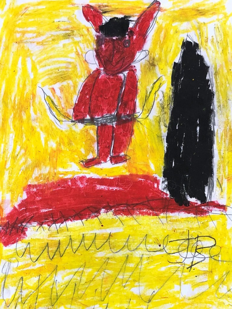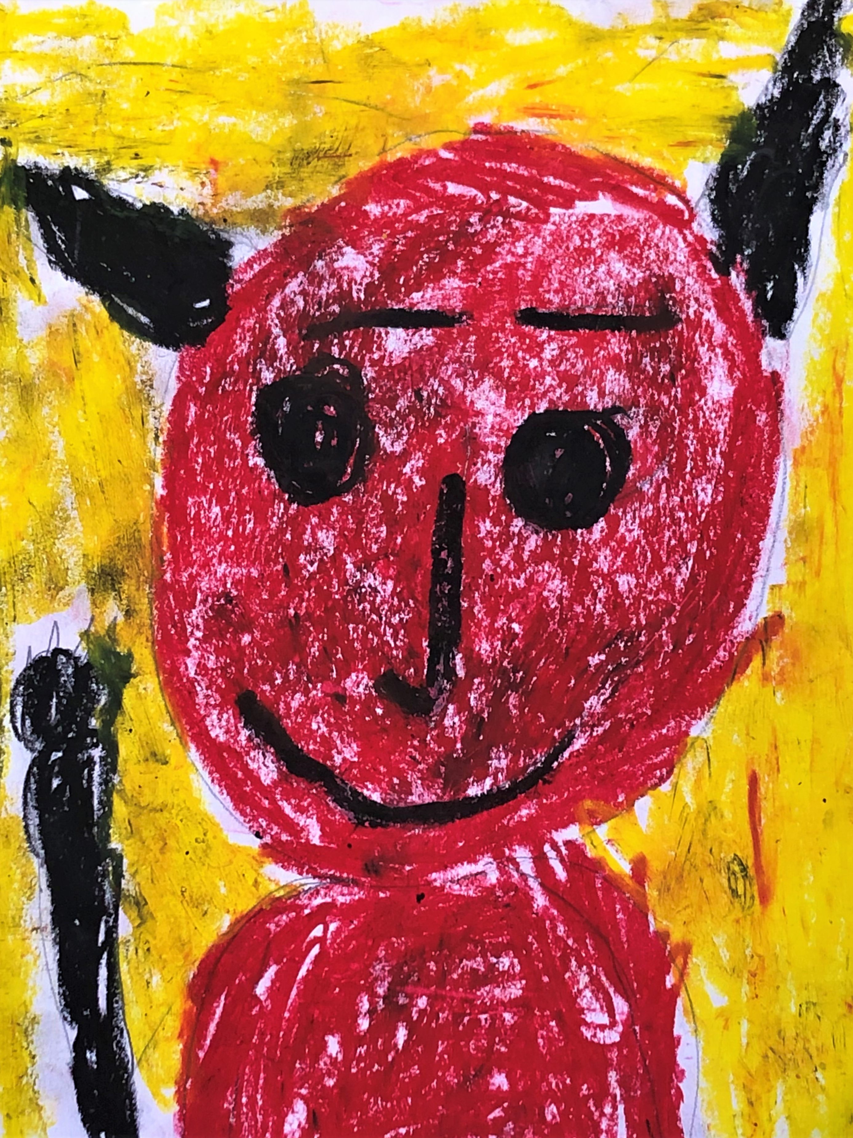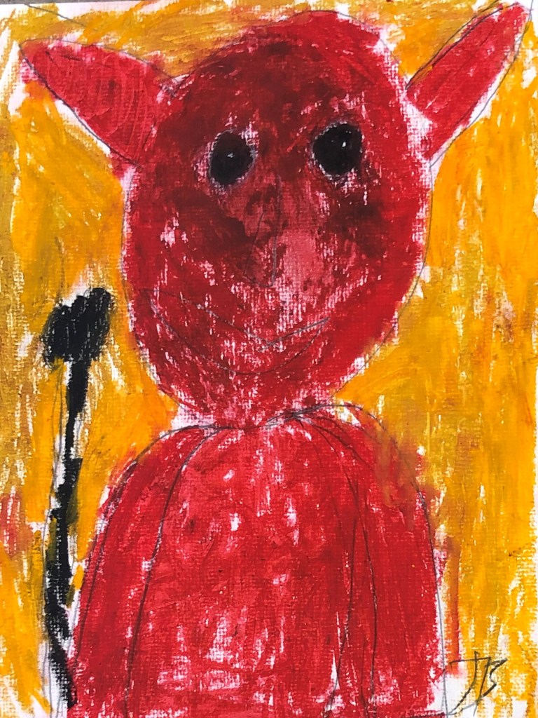 Currently, I create portraits of monsters I imagined like my eyeball monster and a comedic character I call Devilbaby. I create art that shows the many funny things Devilbaby does like play the keyboard and go shopping at the store. When people look at my art I want them to feel. For example, if it’s scary I want them to feel scared and if it’s funny I want them to find it funny.