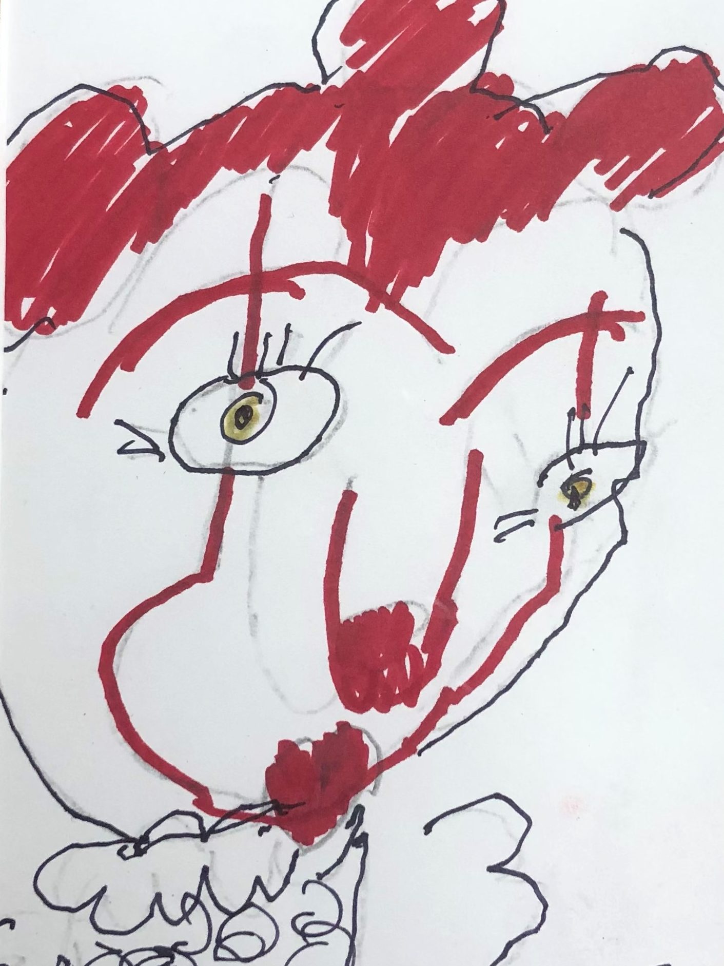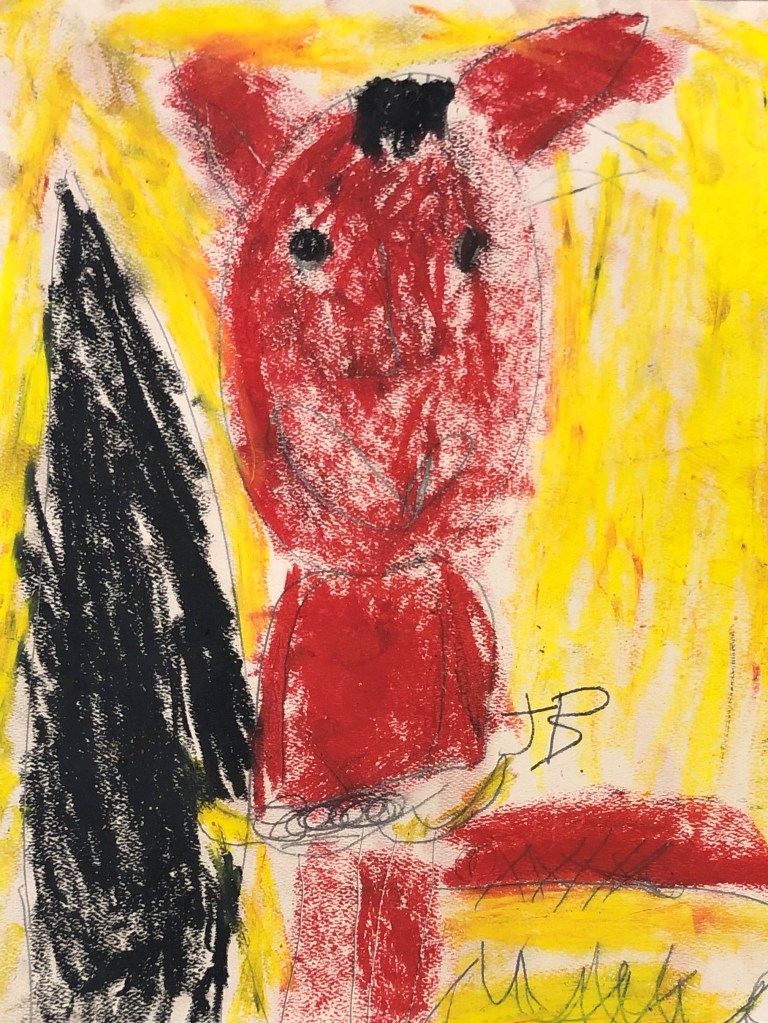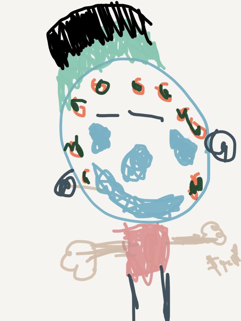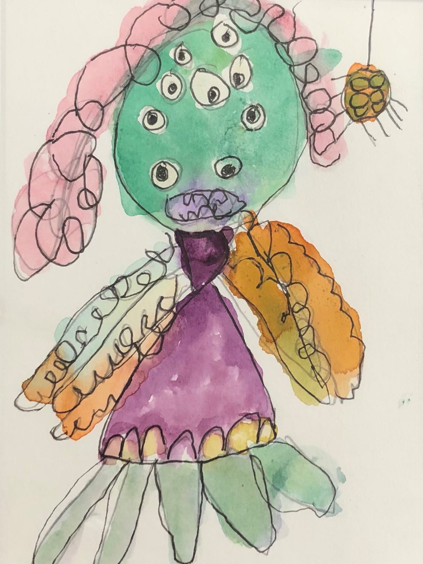 Currently, I create portraits of monsters I imagined like my eyeball monster and a comedic character I call Devilbaby. I create art that shows the many funny things Devilbaby does like play the keyboard and go shopping at the store. When people look at my art I want them to feel. For example, if it’s scary I want them to feel scared and if it’s funny I want them to find it funny.